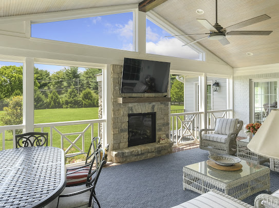 One of our most common requests for an updated outdoor space is for a screened-in porch. These spaces often boast beautiful vaulted ceilings and cozy stone fireplaces for ideal comfort. We implement triangular windows in the high vaulted openings of the gable to promote natural lighting and protection from rain.